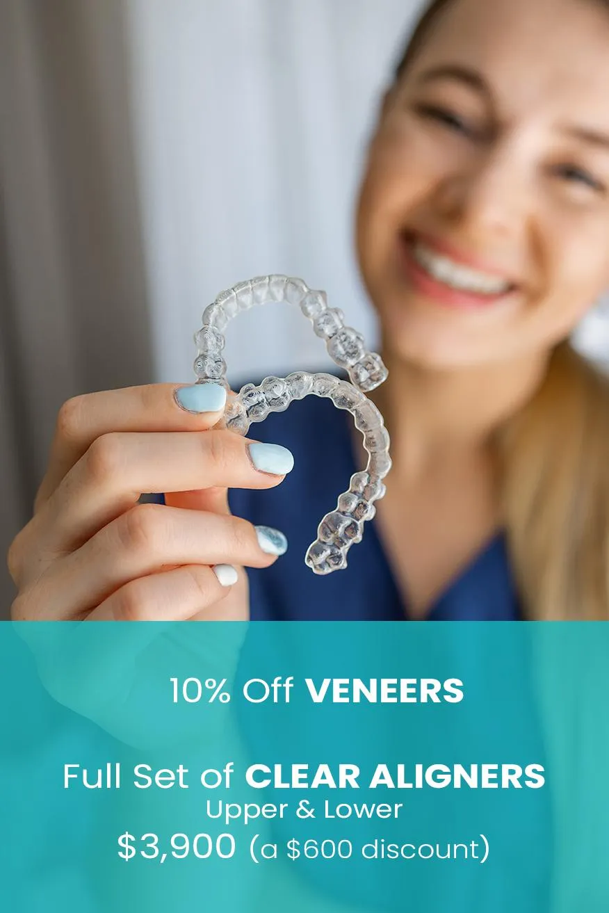 Dr. K is offering 10% off veneers and $3,900 (a $600 discount) for a full set of clear aligners - upper and lower.